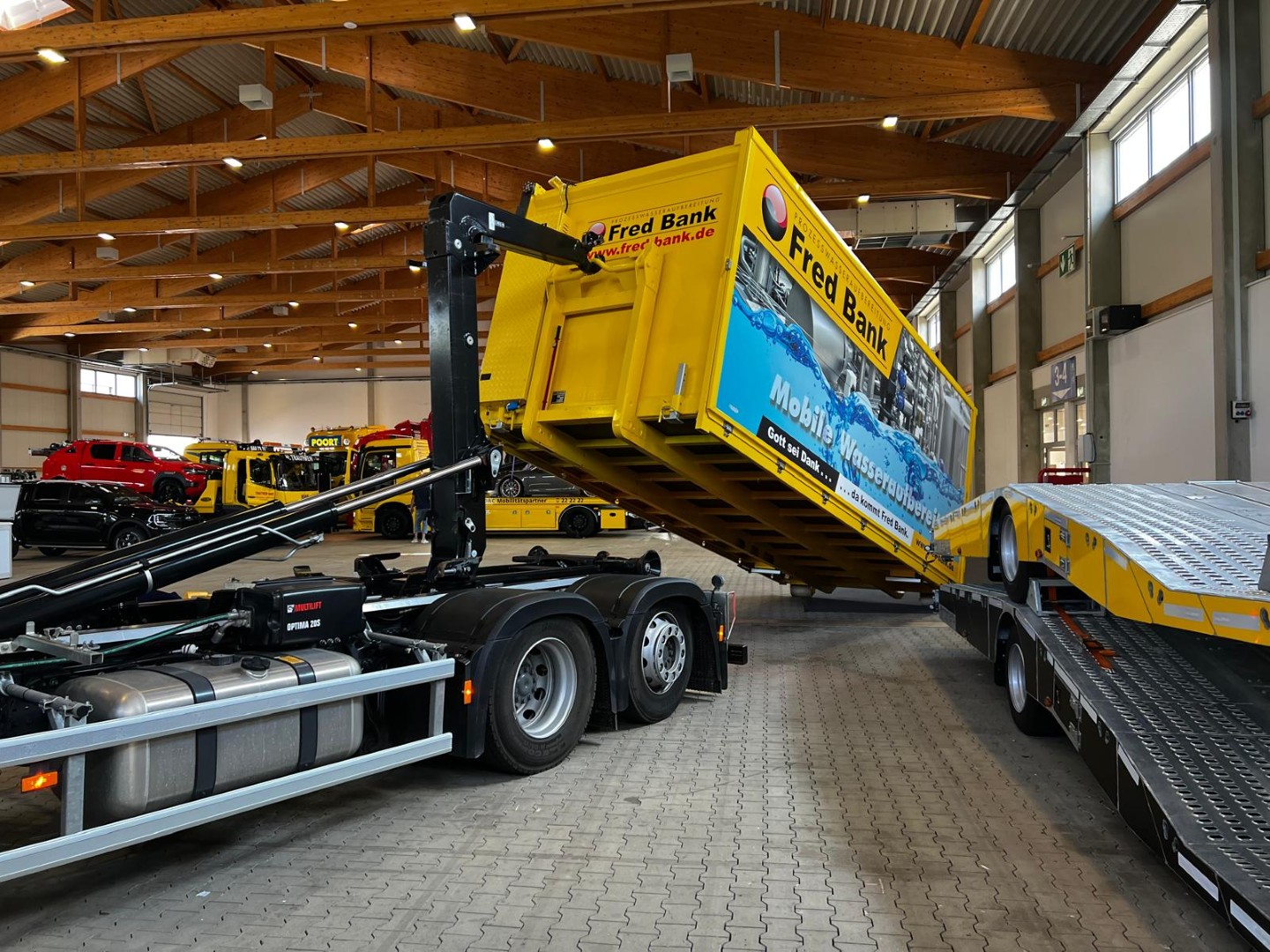 Dank des Hakengerätsystems lassen sich Abrollcontainer unkompliziert absetzen und wieder aufnehmen. Dies spart Zeit und erleichtert das Be- und Entladen auf Baustellen, in Recyclinghöfen oder bei gewerblichen Transportaufgaben.