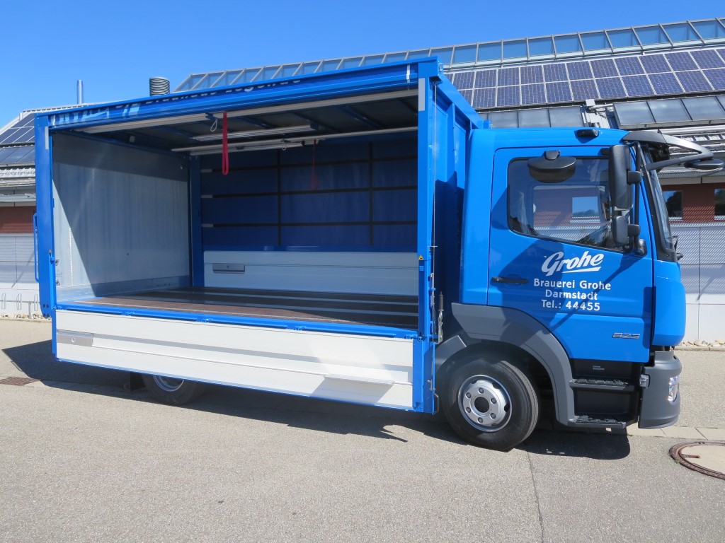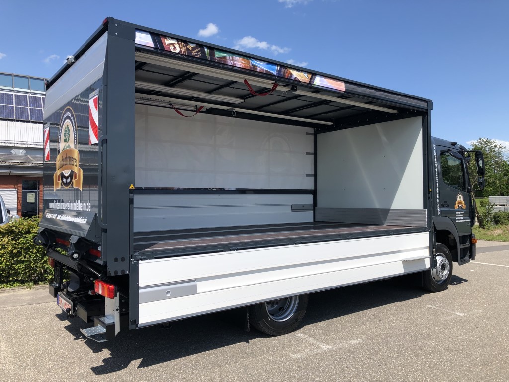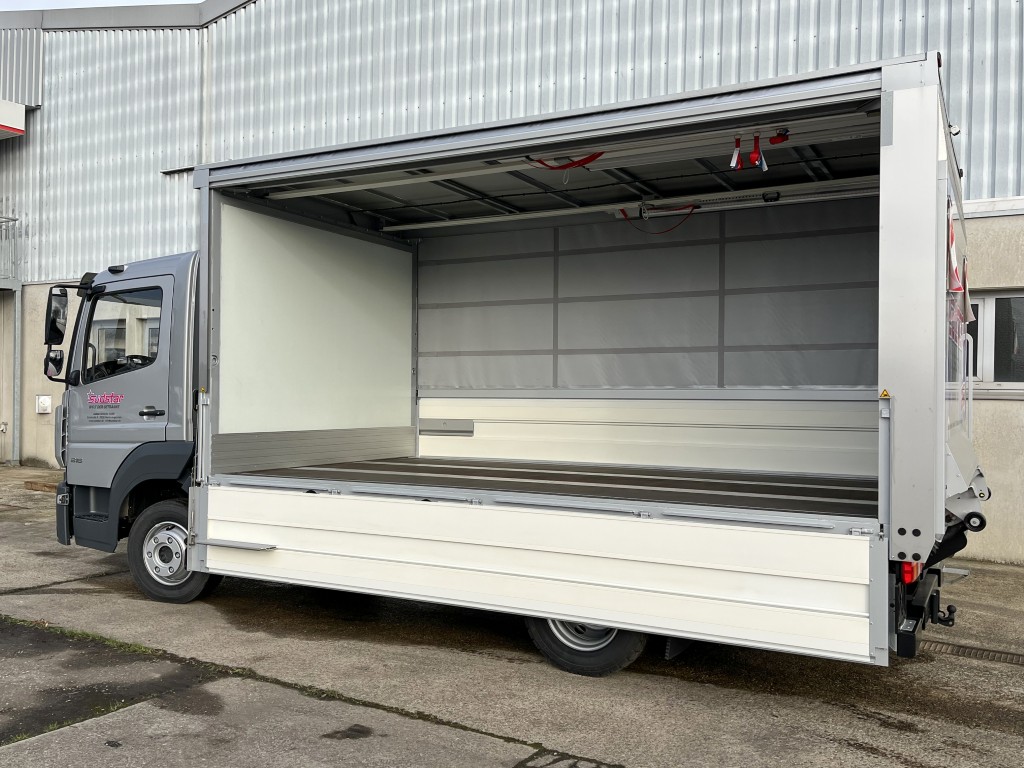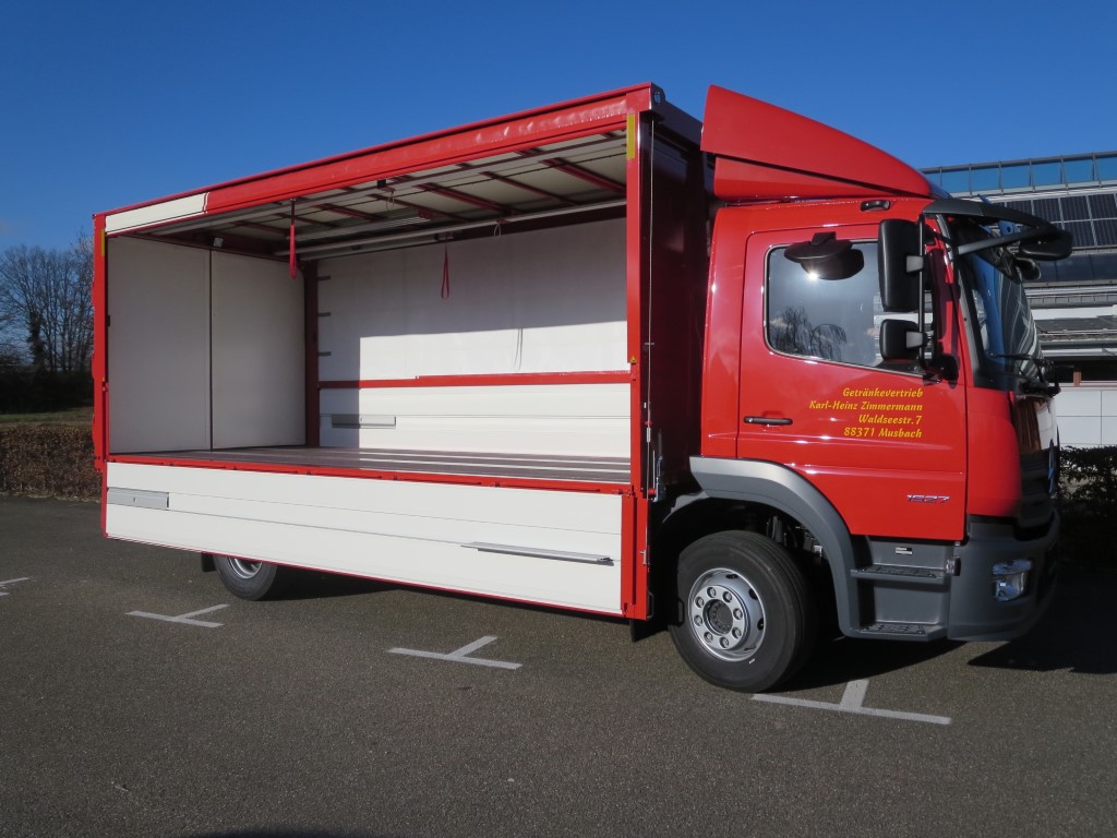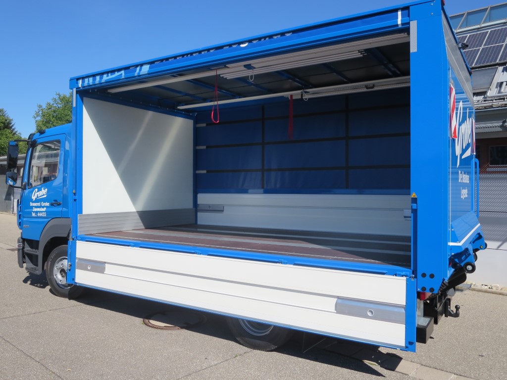 - Geschlossener Kasten, festes Alu-Dach, seitlich Alu-Bordwände, darüber die Rollplane