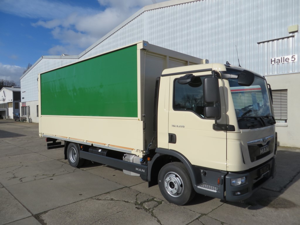 Die seitliche Bordwand wird nach unten abgeklappt, während sich die darüber liegende Plane automatisch nach oben aufrollt und vollständig im Dach verschwindet. Dadurch bleibt die Ladefläche komplett frei zugänglich. Der Schließvorgang funktioniert ebenso schnell und komfortabel über die Zentralverriegelung an der Stirnwand.