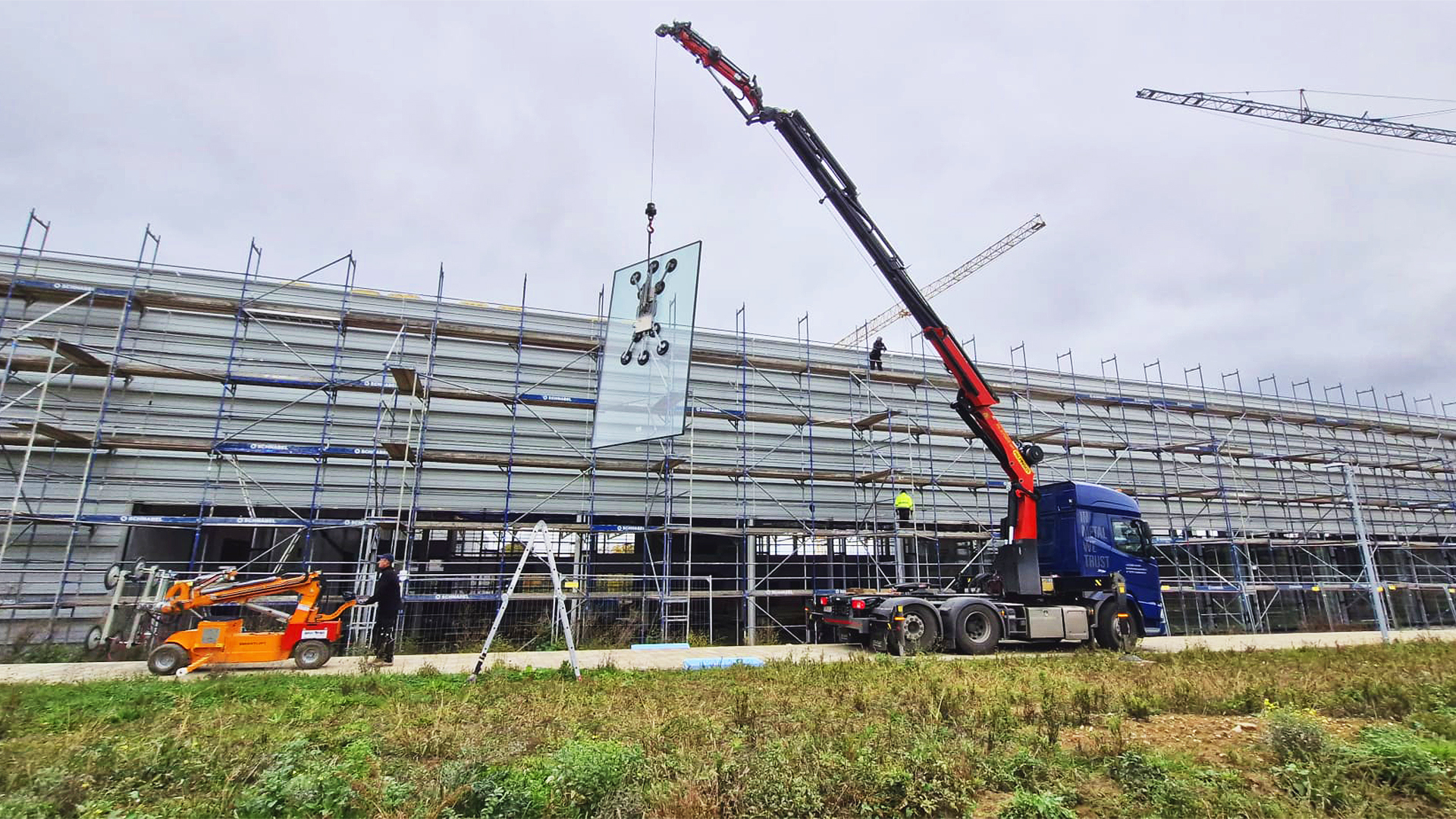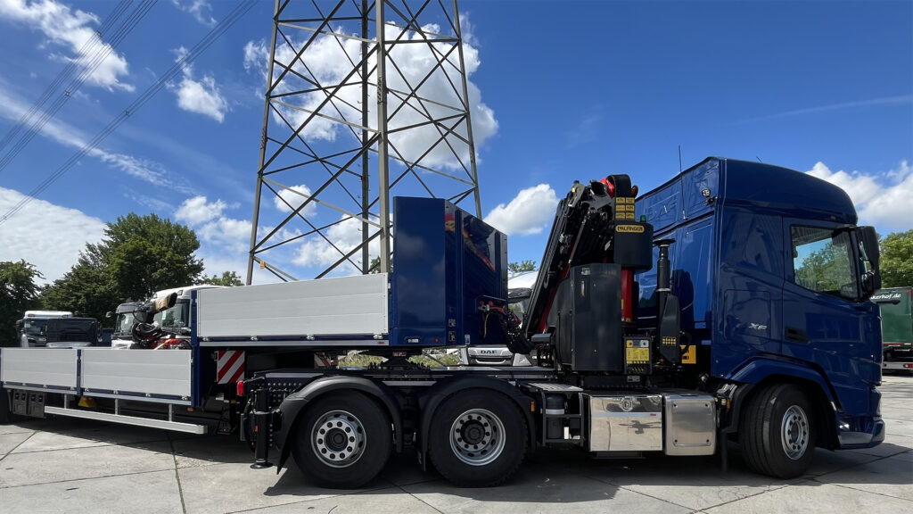 Auf eine DAF XF 480 3-Achs Sattelzugmaschine, die von EBB Truck-Center GmbH ausgeliefert und übergeben wurde, montierten wir einen speziellen Kranaufbau, der u.a. bei der Lieferung und Montage der Fensterelemente zum Einsatz kommt.