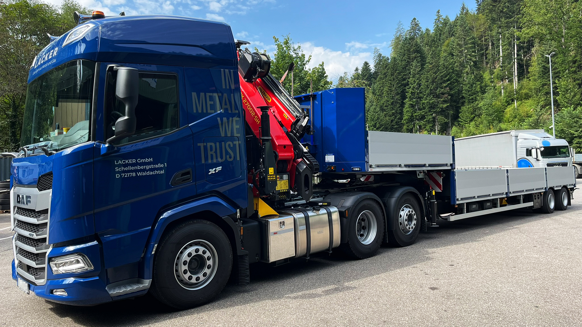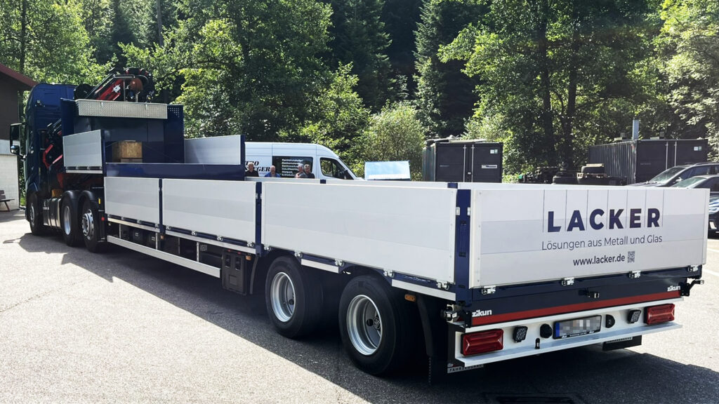 Passend dazu wurde bei zikun der perfekt darauf abgestimmte, hydraulisch gelenkte Sattelauflieger gebaut. Diese Kombination garantiert höchste Effizienz im Transport und in der Fertigstellung der anspruchsvollen und außergewöhnlichen Metallbau- und Glaskonstruktionen, für die LACKER bekannt ist.