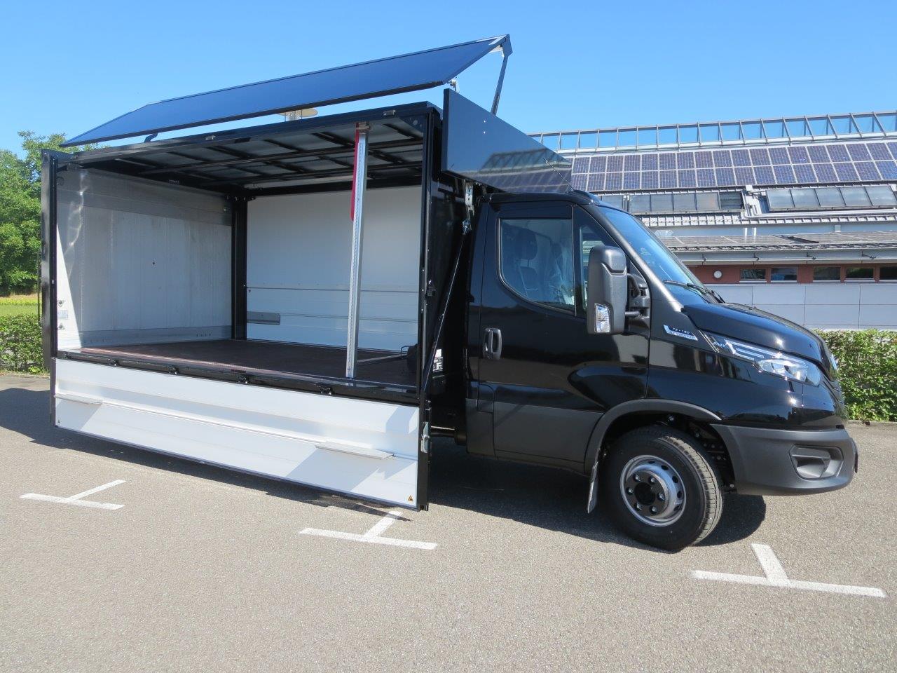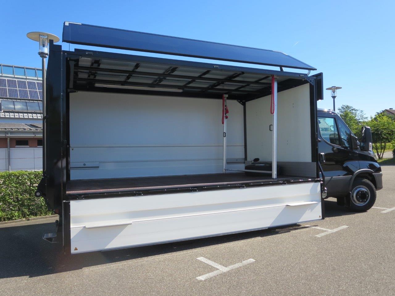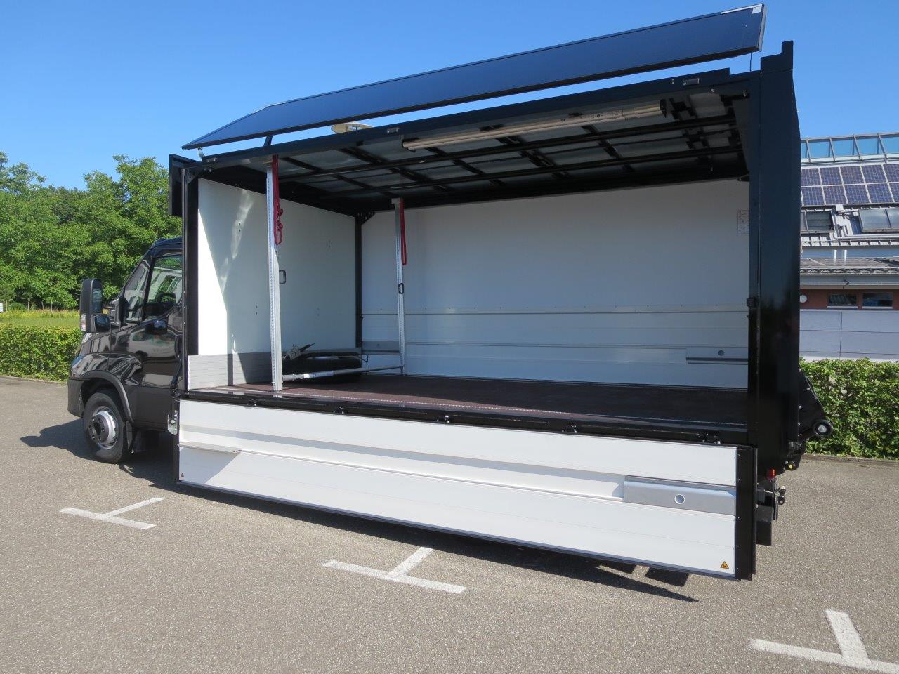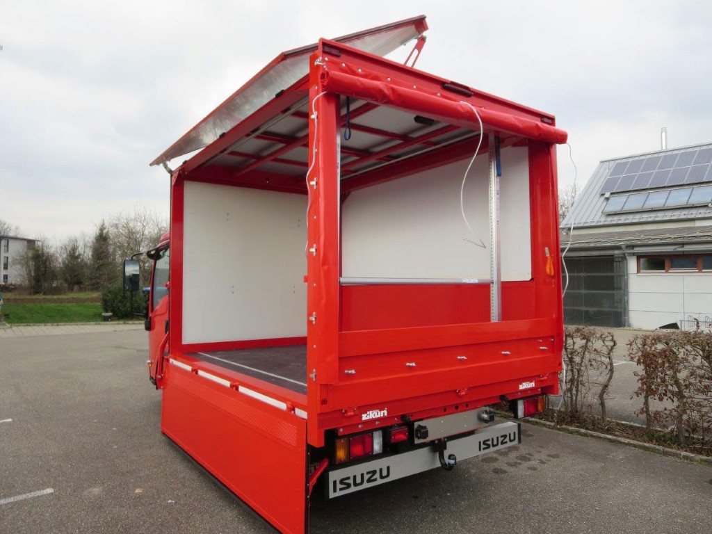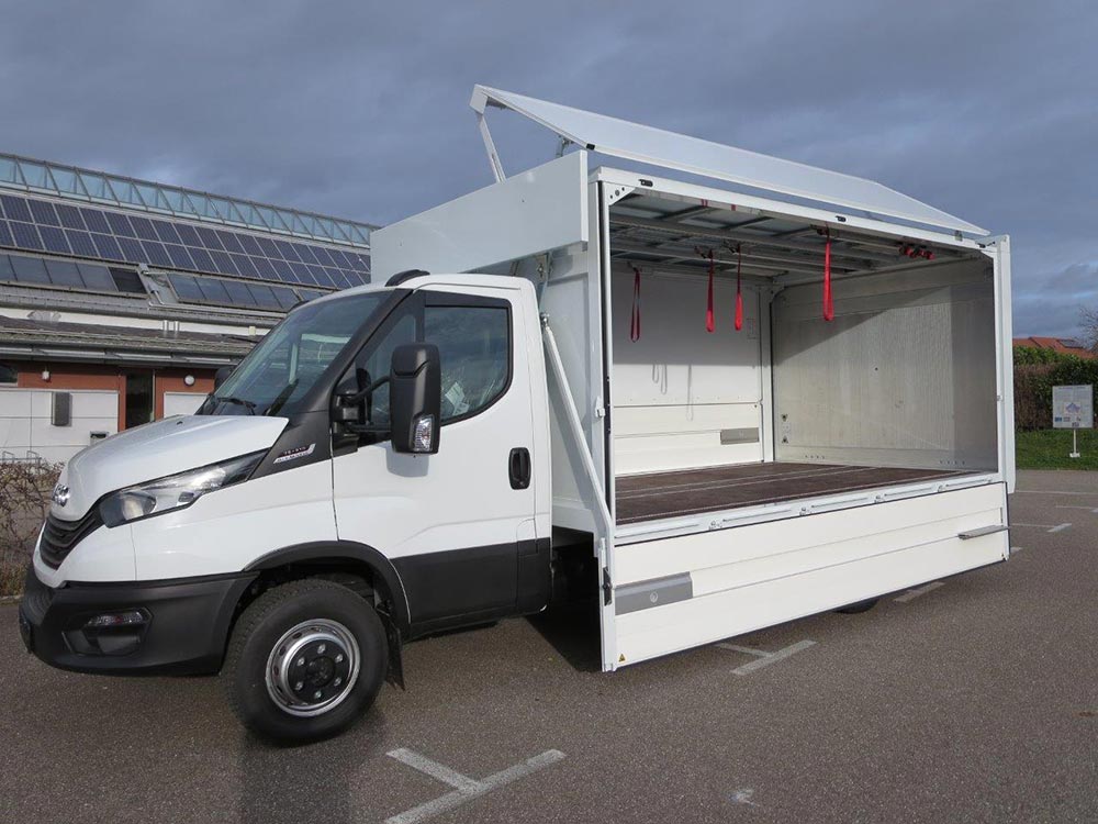 - Geschlossener Aufbau, festes Dach, Alu-Klappwand unten, Klappwand oben aus speziellen Alu-Verbundplatten, glatte Werbefläche