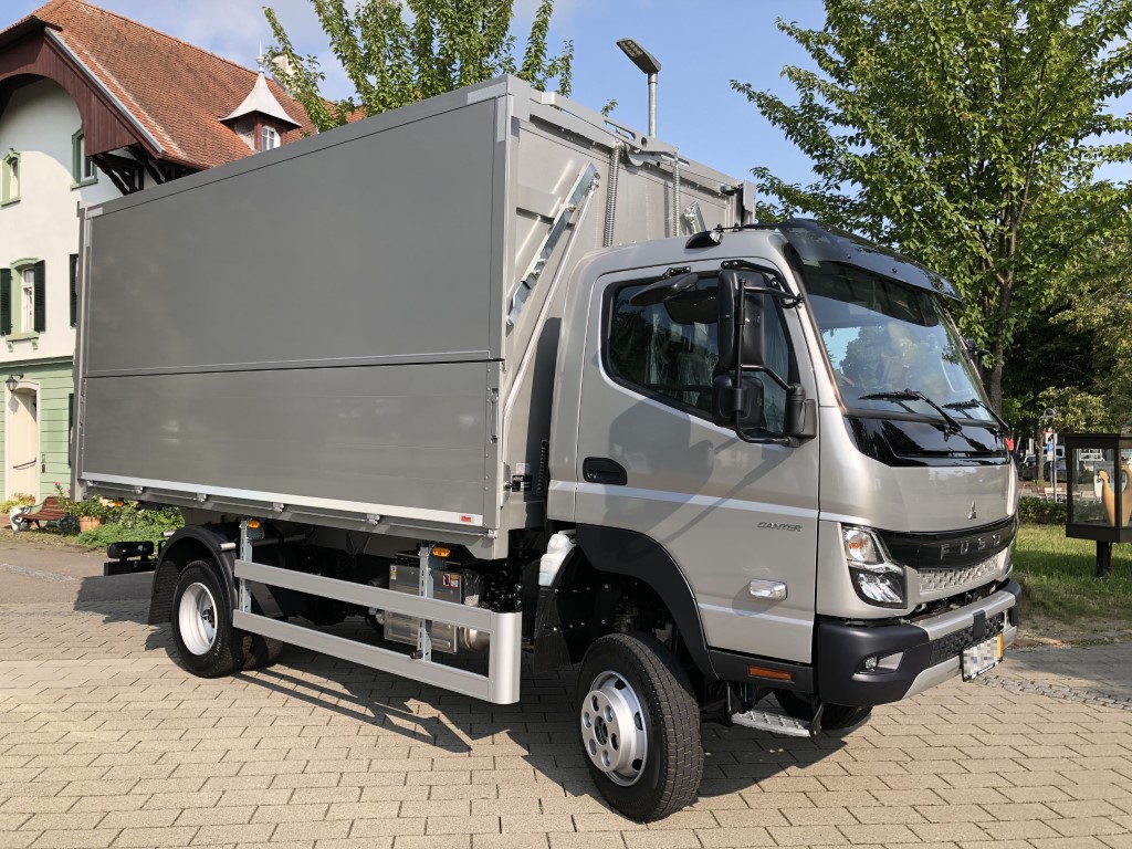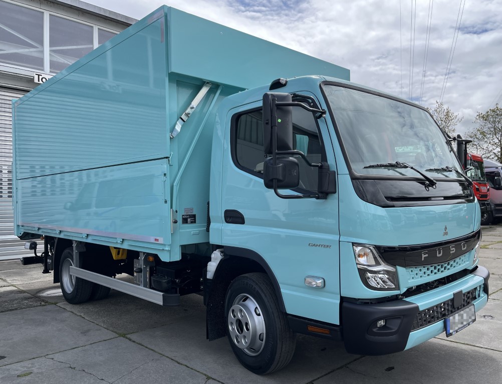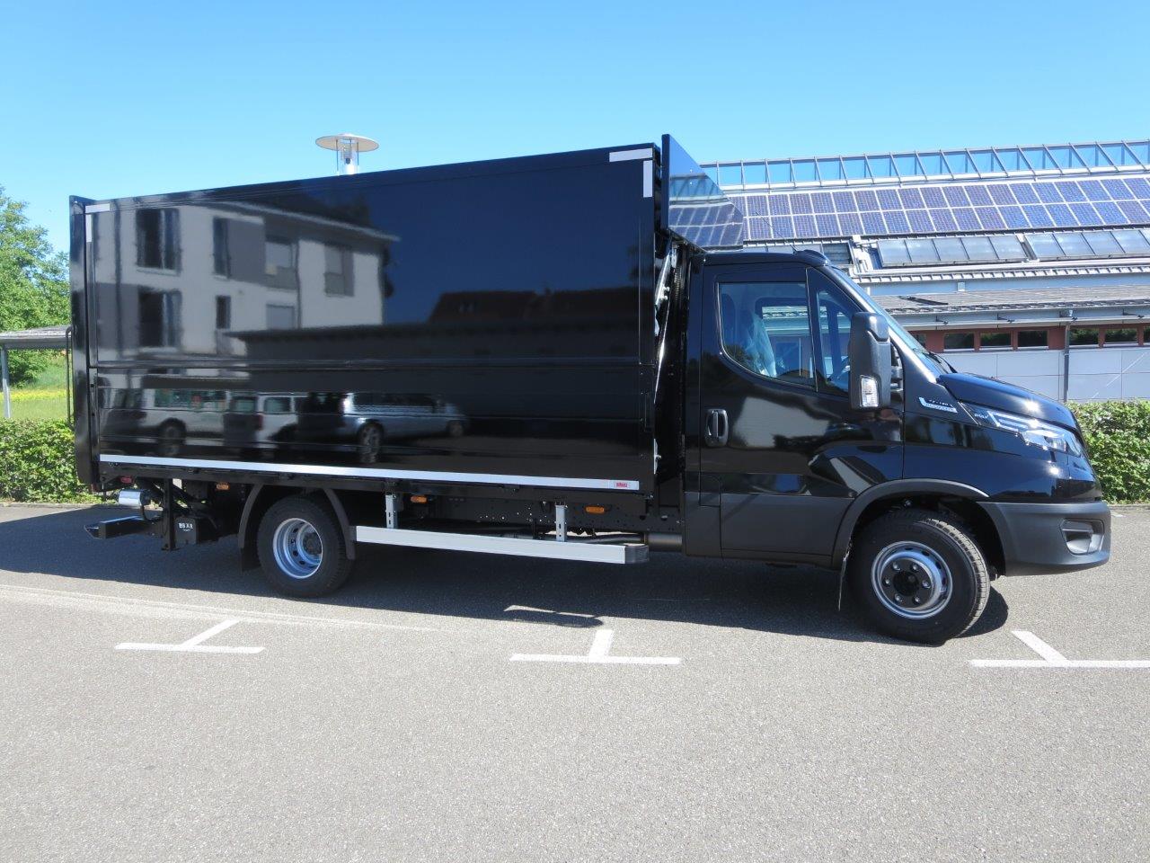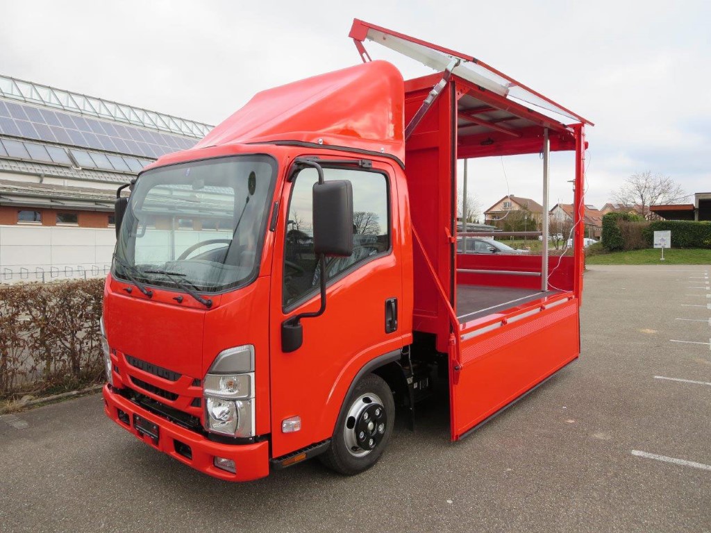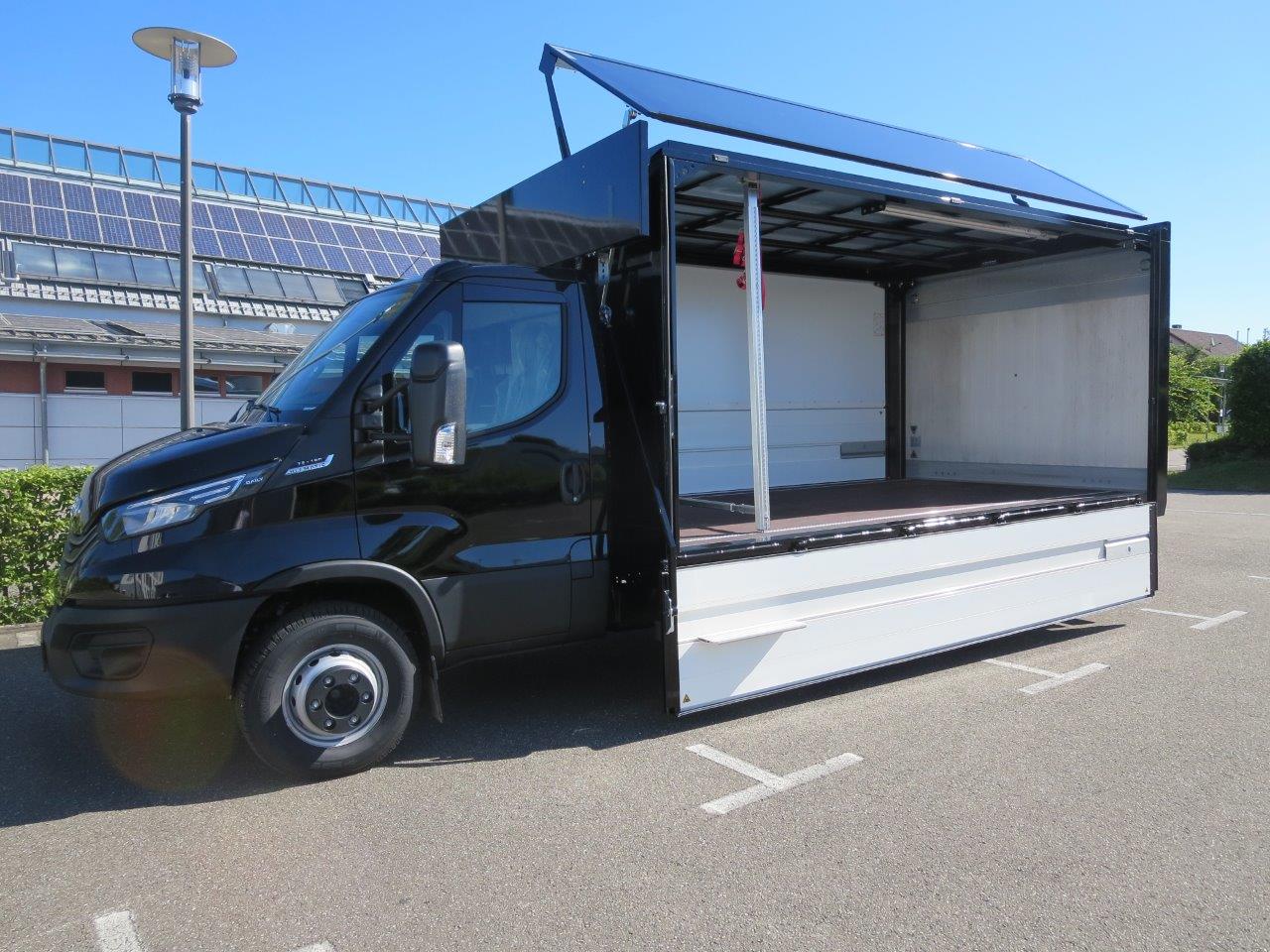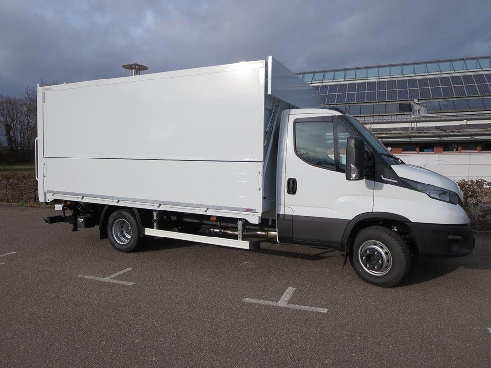 - Geschlossener Aufbau, festes Dach, Alu-Klappwand unten, Klappwand oben aus speziellen Alu-Verbundplatten, glatte Werbefläche