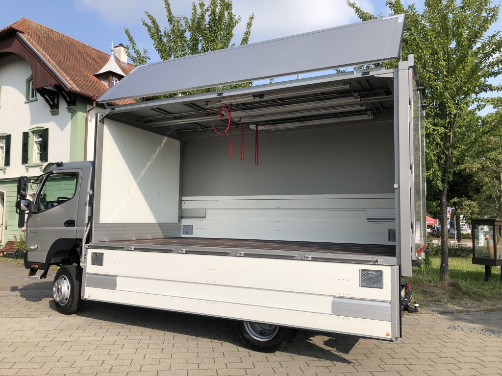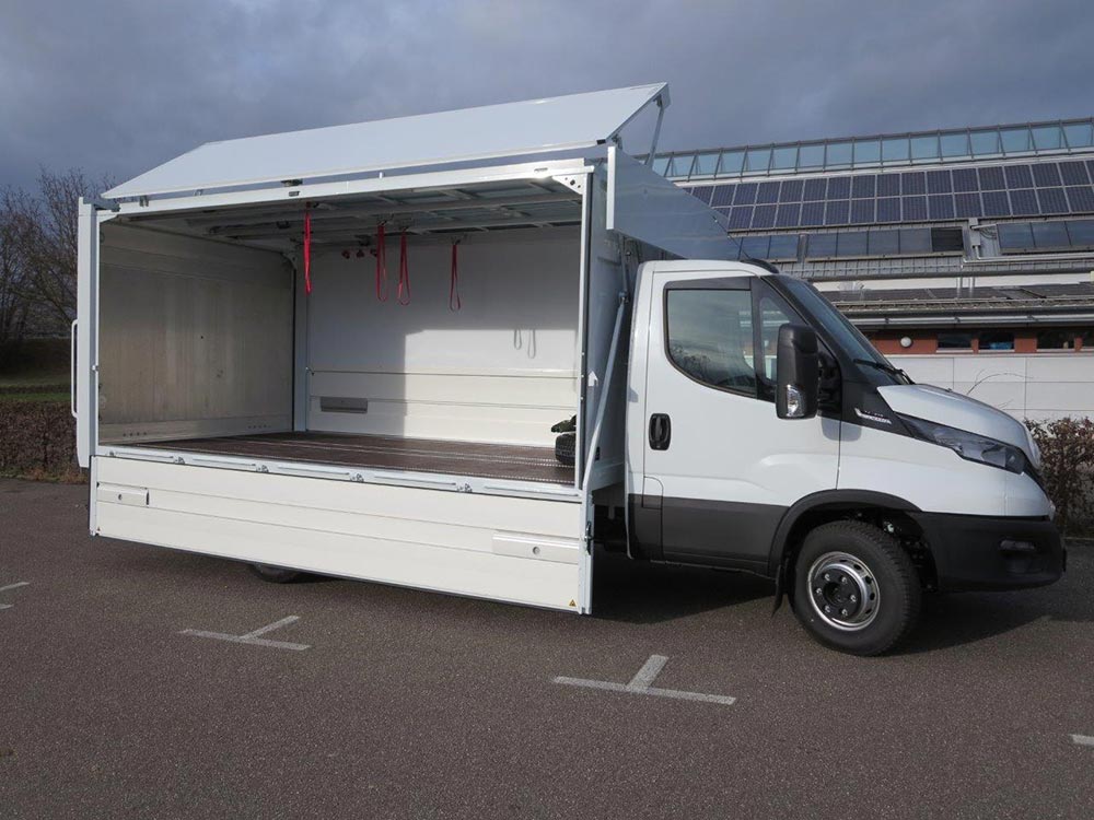 - Schnelle, einfache und leichtgängige Bedienung; untere Bordwand wird nach unten gezogen, die Oberklappe schwenkt analog dazu auf das Dach